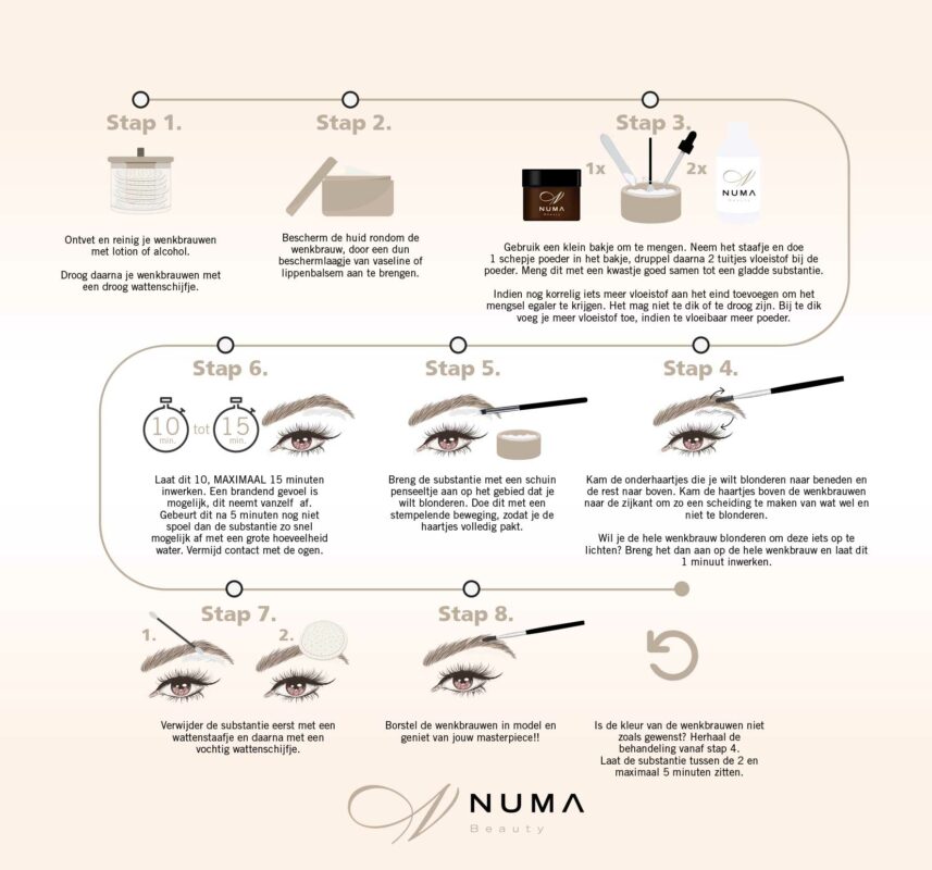 Wist je dat je met onze blondeer niet alleen je wenkbrauwen kan blonderen maar alle haartjes in het gelaat? Bovenlip, kin, wangen. Je kan ook je volledige wenkbrauwen iets oplichten indien deze heel donker zijn. Zie hierboven het stappenplan en de uitleg video.